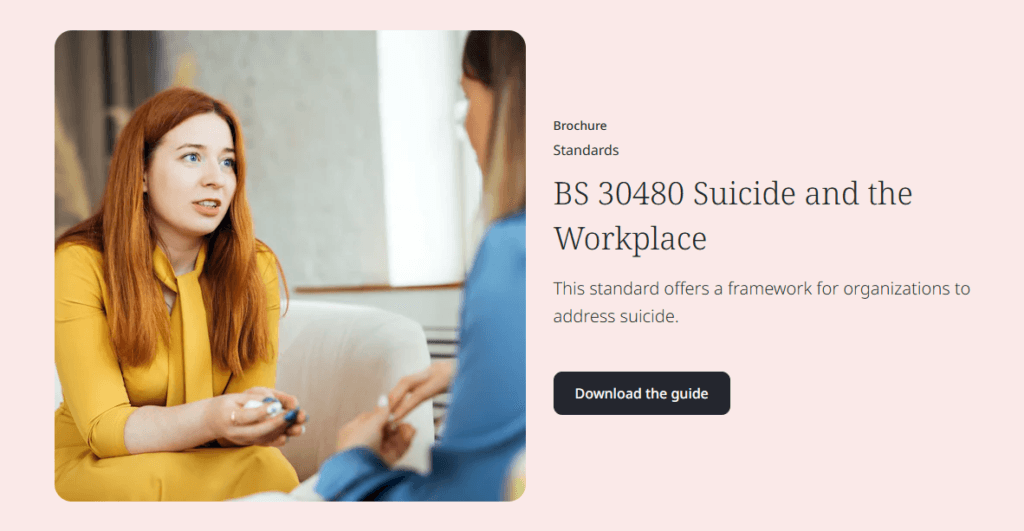 The latest British Standard on Suicide Prevention Guidance, published on 30 November 2025, is designed to help organisations create safer, more compassionate environments for everyone who works with or depends on them. Its aim is to provide clear, practical direction on recognising risks, strengthening safeguarding measures, and ensuring people feel confident and prepared to respond when someone may be struggling. By encouraging thoughtful leadership, open communication, and consistent training, the standard supports organisations in building a culture where wellbeing is truly prioritised. Download the Guide
